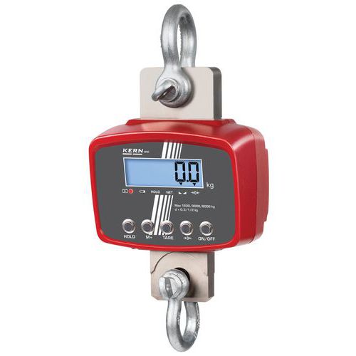 Weeghaak HFD met drie bereiken (T=Triple), wisselt automatisch van weegbereik [Max] en uitlezing [d]. Radiografische afstandsbediening in serie. Radiobereik tot 20 m. Hold-functie. Opening massief, niet draaibaar. Grotere weergave: hoogte van cijfers 30 mm, achtergrondverlichting.