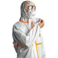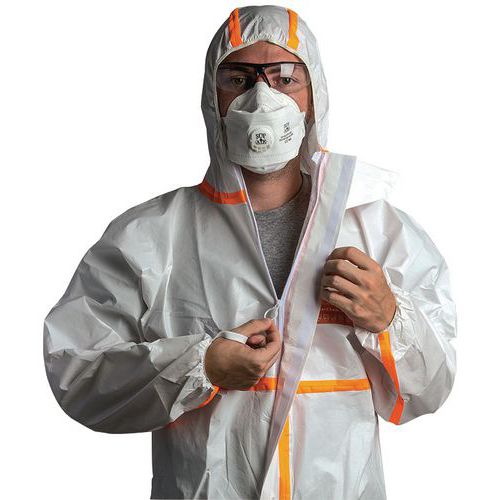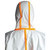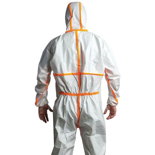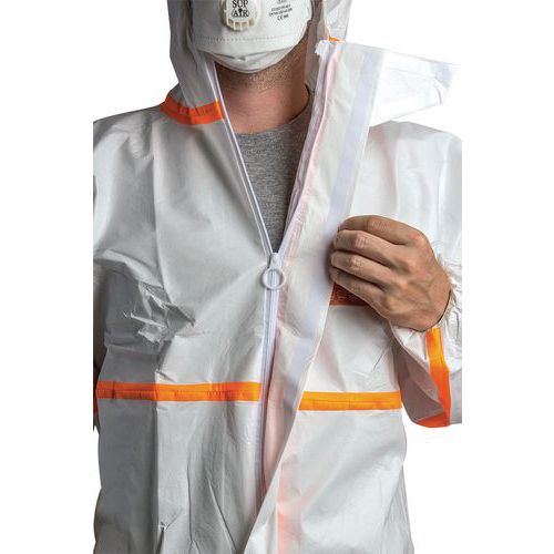 Overall voor een effectieve bescherming tegen radioactieve verontreinigingen in de vorm van deeltjes. Met gestikte naden met overslag van een oranje, thermisch gelijmde band voor een optimale bescherming. De pijpen en de mouwen worden met elastiek op de plaats gehouden om te voorkomen dat het kledingstuk niet omhoog kruipt tijdens de bewegingen. Elastische taille, boorden en pijpen. Ritssluiting onder overslag met klittenband. Antistatische overall zonder siliconen. Gemaakt op basis van microporeuze gelamineerde folie. Elastisch kapmasker, 3-zijdig. Kinstuk.