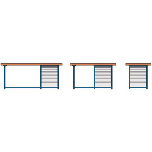Stevige werkbank geschikt voor gebruik op de werkplaats. Uitgerust met een stevig legbord in multiplex. Met 6 afsluitbare laden om uw materiaal op te bergen.