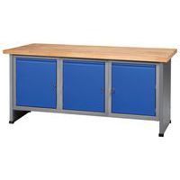 - Voor lichte montagewerkzaamheden. Grijs gemelamineerd blad van 20 mm dik. Rechte zijkant 2 mm van ABS, whitewash. Grijze behuizing RAL 7035, laden blauw RAL 5015. Frame bestaat uit 2 ladderpoten van buisstaal 40 x 40 en 3 verbindingsstukken van geplooid plaatstaal 25/10e. Maximaal draagvermogen: 500 kg. 4 kunststof uiteinden voor bescherming van de vloer. Hoogte/diepte werkbank: 82 x 75 cm.