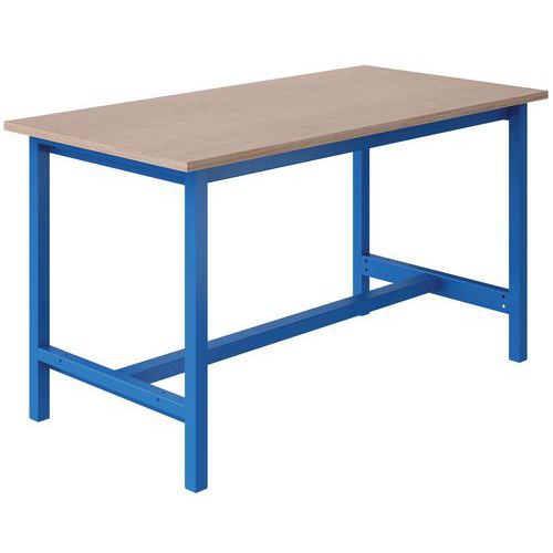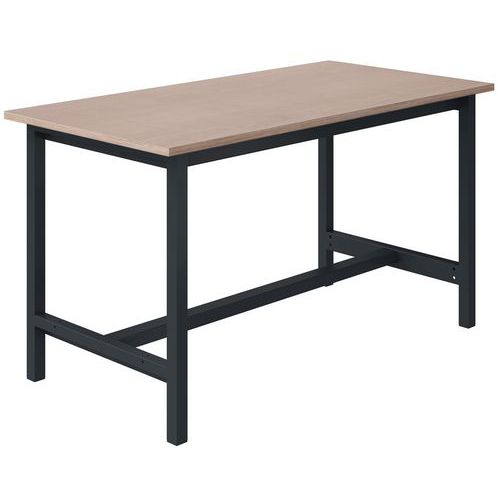 2 ladderpoten van buisstaal 40 x 40 mm. 3 verbindingsstukken van geplooid plaatstaal 25/10e. 4 kunststof uiteinden voor bescherming van de vloer. H/D blad: 82,4 x 75 cm. Rechte rand, dikte 22 mm. Frame en onderstel epoxy RAL 5015 blauw of RAL 7016 antraciet, naar keuze