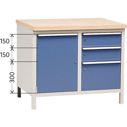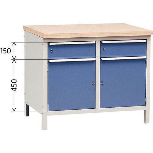 Werkbank voorzien van een kast met afsluitbare deur voor meer ruimte voor veilige opslag.