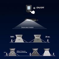 Gegarandeerde verlichting 365 dagen per jaar. Met bewegingssensor: de lamp wordt overdag opgeladen en gaat 's nachts automatisch aan. Bedrijfsmodus: tijdens de eerste 5 branduren gaat de lamp branden met maximaal vermogen (3000 lumen) als een beweging wordt gedetecteerd op een afstand van 8 meter.