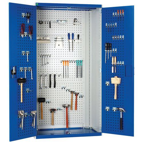 Werkplaatskast voor het overzichtelijk opbergen van uw gereedschap. Voorzien van perfogaten en sleufpanelen. Sluit de deuren veilig af met de driepuntssluiting en het cilinderslot. Veiligheidstips: - Plaats het meubel op een vlak oppervlak - Bevestig het aan de muur of een scheidingswand met een speciale bevestiging - Let erop dat u de aanbevolen maximale belasting niet overschrijdt en zorg voor een goede verdeling