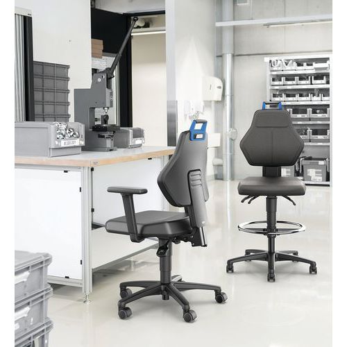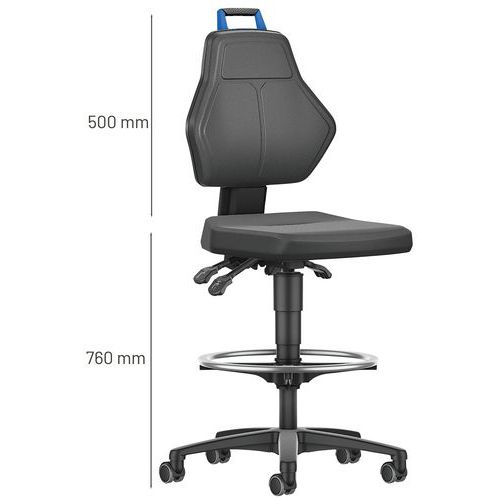 | Productnaam | Werkplaatsstoel, Met armleggers: nee, Type voet: Wielen, Zitting materiaal: Polyurethaan, Stoel model: Hoog |
