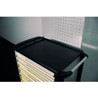Optimaal laadvermogen van 40 kg per lade, 400 kg voor het geheel Optimaal gebruik dankzij de totale uitbreiding en de optimale hoogte aan de voorzijde van de laden Perfecte veiligheid op het werk. Centrale vergrendeling en individuele of dubbele veiligheid op de laden en tegen ongewenst openen onderweg Eenvoudige aanpasmogelijkheden met geperforeerde zij- en achterwand voor de bevestiging van accessoires en haken voor gereedschap Groot gebruiksgemak met ergonomische en stabiele duwstang Totale mobiliteit dankzij de twee soepele vaste wielen en de twee zwenkwielen van massief rubber Extra oppervlak om iets op te leggen en om te werken met bekleding van bestendig hout of van slipvast kunststof en vakken voor kleine voorwerpen Extra veiligheid dankzij de bescherming van de hoeken van stevig kunststof die werken als dempers Max. belasting (kg) : 400 kg