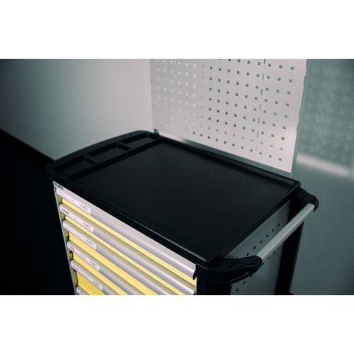 Optimaal laadvermogen van 40 kg per lade, 400 kg voor het geheel Optimaal gebruik dankzij de totale uitbreiding en de optimale hoogte aan de voorzijde van de laden Perfecte veiligheid op het werk. Centrale vergrendeling en individuele of dubbele veiligheid op de laden en tegen ongewenst openen onderweg Eenvoudige aanpasmogelijkheden met geperforeerde zij- en achterwand voor de bevestiging van accessoires en haken voor gereedschap Groot gebruiksgemak met ergonomische en stabiele duwstang Totale mobiliteit dankzij de twee soepele vaste wielen en de twee zwenkwielen van massief rubber Extra oppervlak om iets op te leggen en om te werken met bekleding van bestendig hout of van slipvast kunststof en vakken voor kleine voorwerpen Extra veiligheid dankzij de bescherming van de hoeken van stevig kunststof die werken als dempers