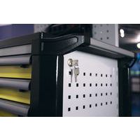 Optimaal laadvermogen van 40 kg per lade, 400 kg voor het geheel Optimaal gebruik dankzij de totale uitbreiding en de optimale hoogte aan de voorzijde van de laden Perfecte veiligheid op het werk. Centrale vergrendeling en individuele of dubbele veiligheid op de laden en tegen ongewenst openen onderweg Eenvoudige aanpasmogelijkheden met geperforeerde zij- en achterwand voor de bevestiging van accessoires en haken voor gereedschap Groot gebruiksgemak met ergonomische en stabiele duwstang Totale mobiliteit dankzij de twee soepele vaste wielen en de twee zwenkwielen van massief rubber Extra oppervlak om iets op te leggen en om te werken met bekleding van bestendig hout of van slipvast kunststof en vakken voor kleine voorwerpen Extra veiligheid dankzij de bescherming van de hoeken van stevig kunststof die werken als dempers