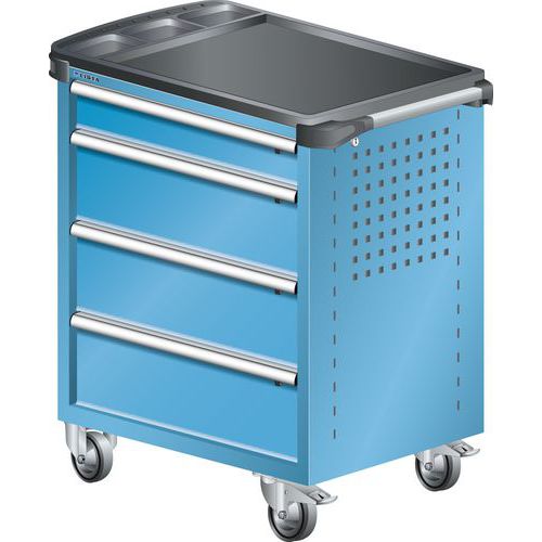 Optimaal laadvermogen van 40 kg per lade, 400 kg voor het geheel Optimaal gebruik dankzij de totale uitbreiding en de optimale hoogte aan de voorzijde van de laden Perfecte veiligheid op het werk. Centrale vergrendeling en individuele of dubbele veiligheid op de laden en tegen ongewenst openen onderweg Eenvoudige aanpasmogelijkheden met geperforeerde zij- en achterwand voor de bevestiging van accessoires en haken voor gereedschap Groot gebruiksgemak met ergonomische en stabiele duwstang Totale mobiliteit dankzij de twee soepele vaste wielen en de twee zwenkwielen van massief rubber Extra oppervlak om iets op te leggen en om te werken met bekleding van bestendig hout of van slipvast kunststof en vakken voor kleine voorwerpen Extra veiligheid dankzij de bescherming van de hoeken van stevig kunststof die werken als dempers