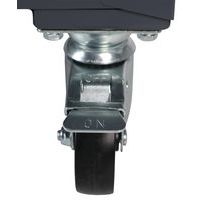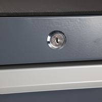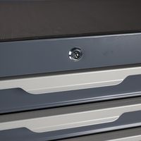 Werkplaatswagen met robuuste stalen constructie, donkergrijs RAL 7015. Grote veiligheid met centraal slot met sleutel. Stabiliteit: geoptimaliseerde wielen, 2 bokwielen en 2 zwenkwielen met rem. Optimaal gebruikscomfort met handgreep aan 1 van de 2 zijden.