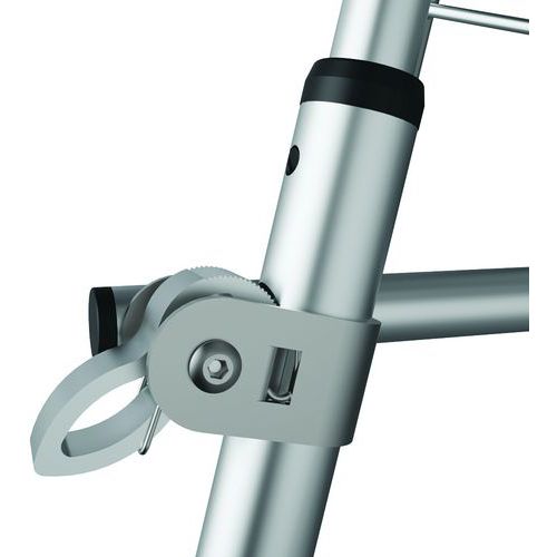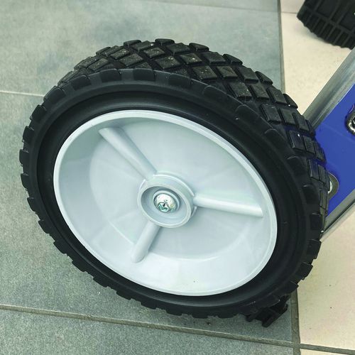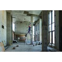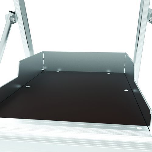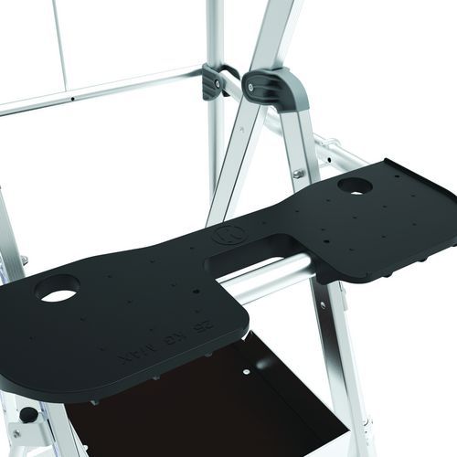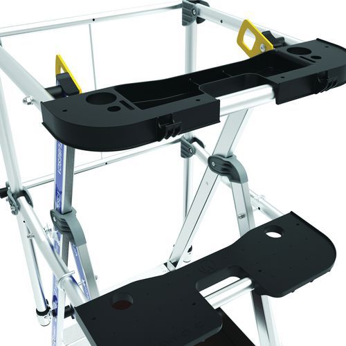 Werkplatform Sherpamatic. Stevige reling aan 4 kanten met liggers voor valbeveiliging aan de achterkant met semi-automatische sluiting. Antisliptreden van 80 mm. Verwijderbare gereedschapshouder met vakindeling, belasting van 25 kg, met geïntegreerde haken (max. 10 kg). XL-legbord, belastbaar tot 25 kg, intrekbare stabilisatoren met afstelling in millimeters. Zeer comfortabele vloer 590 x 400 mm van aluminium met antisliplaag. Ergonomische en comfortabele werkruimte. Wielen Ø 175 mm voor verplaatsing op alle terreintypen.