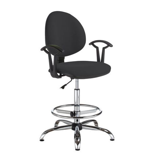 Gestoffeerde, in hoogte verstelbare werkstoel Smarty met ronde voetensteun en voeten voor extra veiligheid. De stoel heeft stevige armleuningen. De zithoogte kan worden afgesteld met een gasveer. De rugleuning is verstelbaar en kan op elke hoogte worden ingesteld.