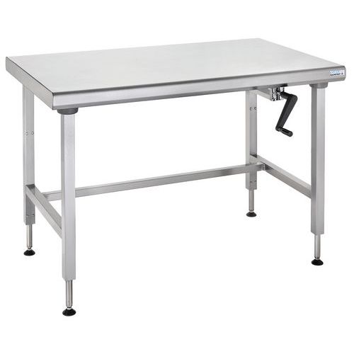 Ergonomisch centrale tafel, eenvoudig te gebruiken met handmatige bediening van de zwengel en ergonomisch doordat de zwengel onder het werkblad kan worden geklapt.