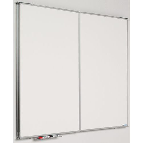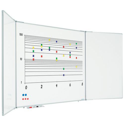Whiteboard met 5 schrijfbare zijden van wit geëmailleerd staal. Extra delen voor uitbreiding van de schrijfzone. Gemagnetiseerd en droog uitwisbaar. Het tussenbord is uitgerust met een extra versteviging, door de aanwezigheid van een achterplaat van gegalvaniseerd staal. Het is ook voorzien van een goot voor de opvang van materiaal. Aan de uiteinden van de delen zijn magneten bevestigd, zodat deze niet onverwacht kunnen worden geopend of gesloten. Eenmaal gesloten bieden de luiken bescherming van vertrouwelijke informatie. Afmetingen geopend: 90 x 240 en 120 x 400 cm.