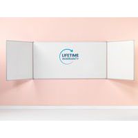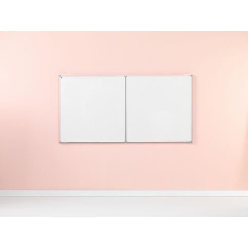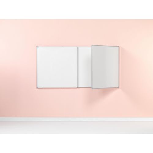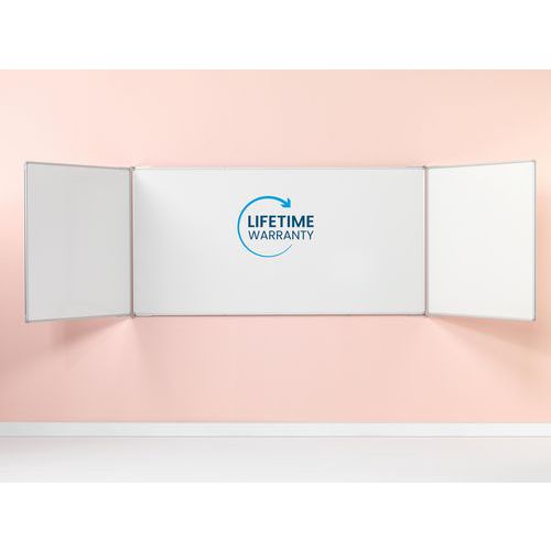 Whiteboard met 5 schrijfbare zijden van wit geëmailleerd staal. Extra delen voor uitbreiding van de schrijfzone. Gemagnetiseerd en droog uitwisbaar. Het tussenbord is uitgerust met een extra versteviging, door de aanwezigheid van een achterplaat van gegalvaniseerd staal. Het is ook voorzien van een goot voor de opvang van materiaal. Aan de uiteinden van de delen zijn magneten bevestigd, zodat deze niet onverwacht kunnen worden geopend of gesloten. Eenmaal gesloten bieden de luiken bescherming van vertrouwelijke informatie. Afmetingen geopend: 90 x 240 en 120 x 400 cm.