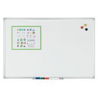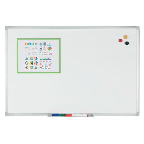 Hoogwaardig magnetisch whiteboard, gelakt. Groot schrijfcomfort dankzij het oppervlak van gelakt staal. Achterkant van het softboard. Kan worden gebruikt om te schrijven of presenteren dankzij de magnetische coating. Stevig en elegant dankzij het aluminium frame. Praktisch dankzij de inbegrepen opberggoot. Eenvoudig droog uitwisbaar. Eenvoudige en snelle muurbevestiging. 4 boorgaten achter in de 4 hoeken (diameter 3,5 mm). Bevestigingsgaten verborgen achter kunststof schroefdoppen. Magnetisch Klantgarantie : 10 jaar