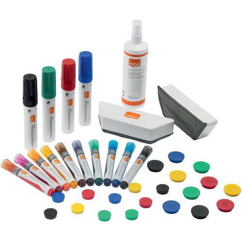 Inclusief 14 veelkleurige whiteboard markers, 10 whiteboard magneten van 24 mm, 10 whiteboard magneten van 32 mm, 2 whiteboard wissers en een reinigingsspray