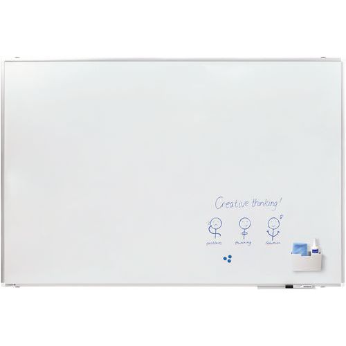 geschikt om met boardmarkers te beschrijven (droog uitwisbaar). Aluminium omlijsting met roomkleurige kunststof hoeken. Zowel horizontaal als verticaal op te hangen. Afleggoot van 30 cm. Eenvoudige wandmontage met verborgen bevestigingssysteem. Wordt compleet geleverd met bevestigingsmaterialen, pennengootje en boardmarker.