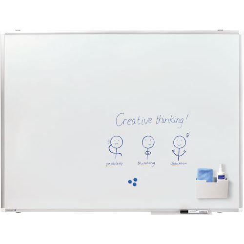 geschikt om met boardmarkers te beschrijven (droog uitwisbaar). Aluminium omlijsting met roomkleurige kunststof hoeken. Zowel horizontaal als verticaal op te hangen. Afleggoot van 30 cm. Eenvoudige wandmontage met verborgen bevestigingssysteem. Wordt compleet geleverd met bevestigingsmaterialen, pennengootje en boardmarker.