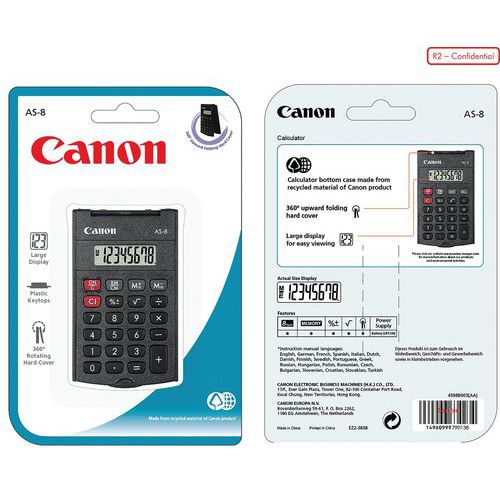 | Technische gegevens | Gebogen ontwerp - behuizing en klep die van hergebruikte Canon-kopieerapparaten zijn gemaakt - 3-toets geheugen, 1 toets %, Ö, &+/- |