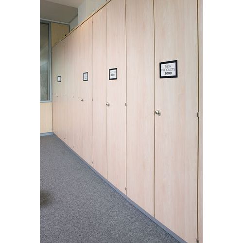 Zelfklevende wissellijst Duraframe® voor glad oppervlak. Dankzij de verplaatsbare zelfklevende achterkant hecht de lijst op alle gladde en harde oppervlakken, zoals muren, deuren, enz. Op een glazen oppervlak is de inhoud aan voor- en achterzijde af te lezen. Eenvoudig en snel actualiseren van informatie, documenten blijven stevig zitten dankzij de magnetische omlijsting. Kan staand of liggend worden gebruikt. De ideale oplossing voor het weergeven van algemene en verplichte bedrijfsinformatie, aanbiedingen, interne regelgeving, mededelingen, enz.