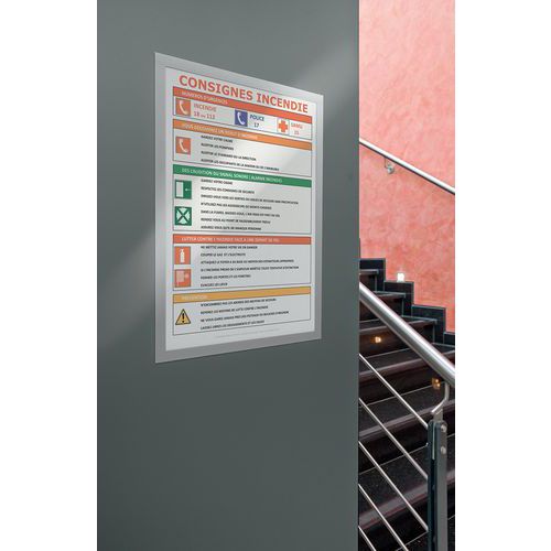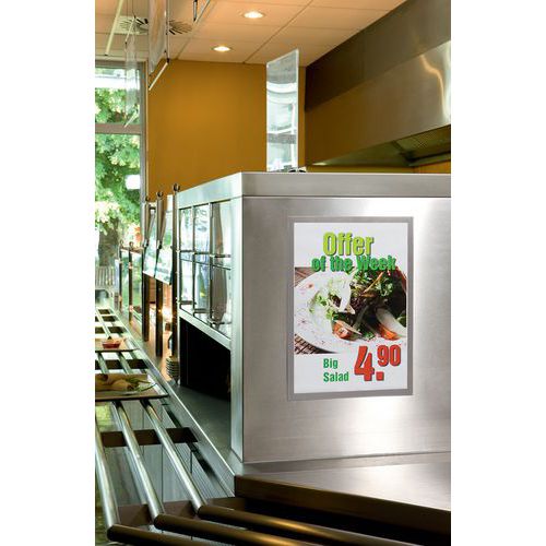 Zelfklevende wissellijst Duraframe® voor glad oppervlak. Dankzij de verplaatsbare zelfklevende achterkant hecht de lijst op alle gladde en harde oppervlakken, zoals muren, deuren, enz. Op een glazen oppervlak is de inhoud aan voor- en achterzijde af te lezen. Eenvoudig en snel actualiseren van informatie, documenten blijven stevig zitten dankzij de magnetische omlijsting. Kan staand of liggend worden gebruikt. De ideale oplossing voor het weergeven van algemene en verplichte bedrijfsinformatie, aanbiedingen, interne regelgeving, mededelingen, enz.