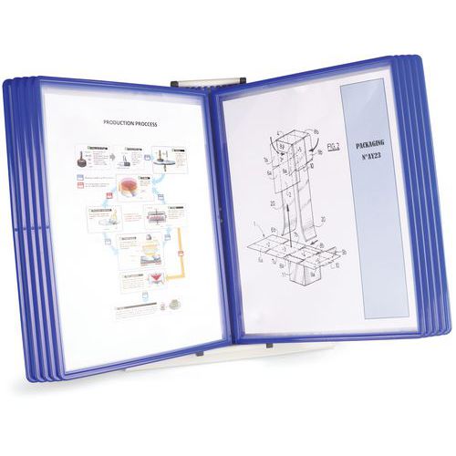 Documentpresentatiesysteem van metaal op een bureau met zijstoppen en 10 draaibare A4-vakken.