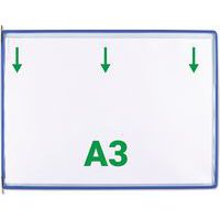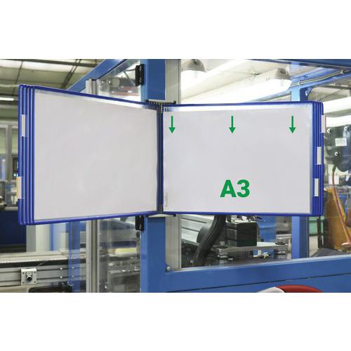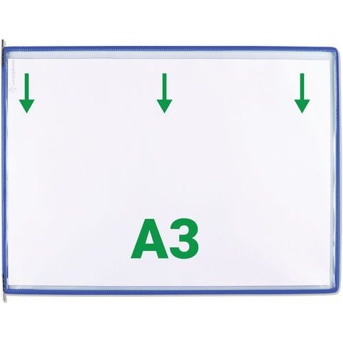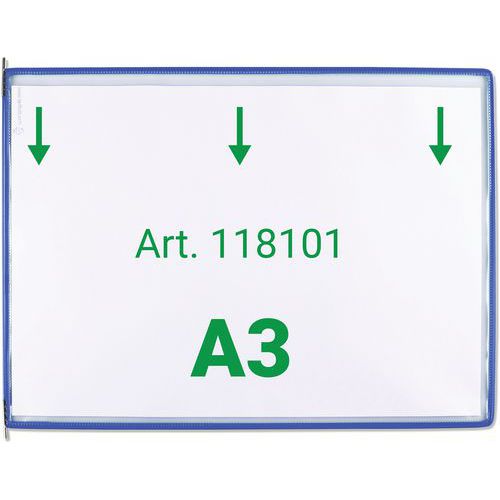 Zichtpaneel Tarifold A3 horizontaal. De originele Tarifold-pocket. Draaizak versterkt met staaldraad en voorzien van robuuste metalen draaipunten. Anti-reflecterend materiaal voor perfecte leesbaarheid. Brede zijopening, insteek vanaf de bovenkant Hoge kwaliteit en ongeëvenaarde sterkte. Het gekleurde frame accentueert de informatie en maakt deze herkenbaar. Het exclusieve Tarifold staaldraadframe versterkt de zak en zorgt ervoor dat deze bestand is tegen intensief dagelijks gebruik. Compatibel met systeempresentatie van wanddocumenten en Tarifold bureaus van Djois . Gemaakt in de EU Klantgarantie : 10 jaar