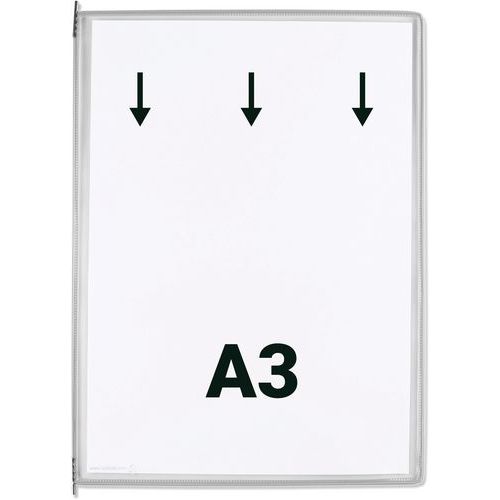 Zichtpaneel Tarifold A3 verticaal. De originele Tarifold paneel. Draaizak versterkt met staaldraad en voorzien van robuuste metalen scharnieren. Ontspiegelend materiaal voor perfecte leesbaarheid. Kleine zijopening, insteek vanaf de bovenkant Hoge kwaliteit en ongeëvenaarde sterkte. Het gekleurde frame accentueert de informatie en maakt deze herkenbaar. Het exclusieve Tarifold staaldraadframe versterkt de zak en zorgt ervoor dat deze bestand is tegen intensief dagelijks gebruik. Compatibel met systeempresentatie van wanddocumenten en Tarifold bureaus van Djois .