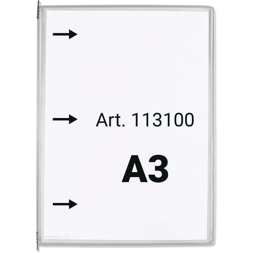 Zichtpaneel Tarifold A3 verticaal, opening links. De originele Tarifold-zak. Draaizak versterkt met staaldraad en voorzien van robuuste metalen draaipunten. Anti-reflecterend materiaal voor perfecte leesbaarheid. Lange zijopening, insteek aan de linkerkant Hoge kwaliteit en ongeëvenaarde sterkte. Het gekleurde frame accentueert de informatie en maakt deze herkenbaar. Het exclusieve Tarifold staaldraadframe versterkt de zak en zorgt ervoor dat deze bestand is tegen intensief dagelijks gebruik. Compatibel met systeempresentatie van wanddocumenten en Tarifold bureaus van Djois . Gemaakt in de EU Klantgarantie : 10 jaar