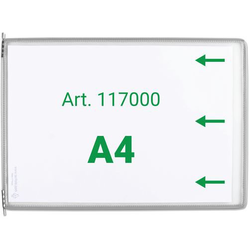 Zichtpaneel Tarifold A4 horizontaal, opening rechts. De originele Tarifold-paneel. Draaizak versterkt met staaldraad en voorzien van robuuste metalen draaipunten. Ontspiegelend materiaal voor perfecte leesbaarheid. Kleine zijopening, insteek via de rechterkant Hoge kwaliteit en ongeëvenaarde sterkte. Het gekleurde frame accentueert de informatie en maakt deze herkenbaar. Het exclusieve Tarifold staaldraadframe versterkt de zak en zorgt ervoor dat deze bestand is tegen intensief dagelijks gebruik. Compatibel met systeempresentatie van wanddocumenten en Tarifold bureaus van Djois.