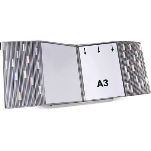 Zichtpanelensysteem wand metaal Tarifold A3 60 zichtpanelen . Metalen lessenaarpresentatiesysteem met zijstoppers en 60 draaibare A4-vakken. Beschermt en organiseert al uw veelgebruikte documenten. Geeft directe toegang tot al uw belangrijke informatie. De ideale Lean-managementtool om informatie helpen structureren Uitbreidbaar van 40 tot 60 vakken. Zakken voorzien van originele, exclusieve Tarifold staaldraadtechnologie. Kan indien nodig ook aan de muur worden gemonteerd. Voor gebruik in fabrieken, supermarkten, magazijnen, kantoren, restaurants, winkels, enz. Voor het weergeven van instructies, procedures, adresboeken, catalogi, prijslijsten etc. Circulaire economie: oude geretourneerde tassen worden gerecycled! Zie voorwaarden op de site. Gemaakt in de EU Klantgarantie : 10 jaar