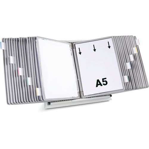 Zichtpanelensysteem wand metaal Tarifold A5 30 zichtpanelen. Metalen lessenaarpresentatiesysteem met zijstoppers en 30 draaibare A5-vakken. Beschermt en ordent al uw veelgebruikte documenten. Geeft directe toegang tot al uw belangrijke informatie. De ideale Lean-managementtool om informatie helpen structureren Uitbreidbaar van 10 tot 30 vakken. Zakken voorzien van originele, exclusieve Tarifold staaldraadtechnologie. Kan indien nodig ook aan de muur worden gemonteerd. Voor gebruik in fabrieken, supermarkten, magazijnen, kantoren, restaurants, winkels, enz. Voor het weergeven van instructies, procedures, adresboeken, catalogi, prijslijsten etc. Circulaire economie: oude geretourneerde tassen worden gerecycled! Zie voorwaarden op de site. Gemaakt in de EU Klantgarantie : 10 jaar