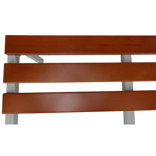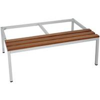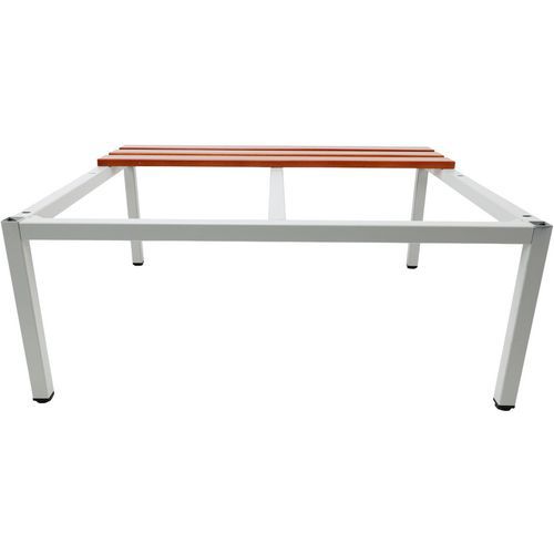 Banksokkel op voet voor garderobekast Modulo. Meer comfort: gebruikers in zittende positie. Onderhoudsvriendelijk: eenvoudige toegang onder de constructie. Metalen constructie met fraaie gelakte afwerking, houten zitting.