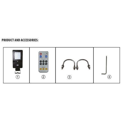 Met bewegingssensor: de lamp wordt overdag opgeladen en gaat 's nachts automatisch aan. Werkwijzen: 1) stand voor constante verlichting: de lamp gaat automatisch 's nachts branden en houdt gedurende 4 uur constant 60% licht, vervolgens in de stand voor bewegingsdetectie. 2) stand voor bewegingsdetectie: de lamp gaat automatisch branden op 100% licht wanneer een beweging wordt gedetecteerd binnen een bereik van ≤ 12 meter en gaat vervolgens na 20 seconden zonder beweging naar 30% licht.