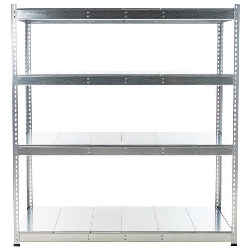 Industriële stelling, eenvoudig en ultrarobuust voor het opslaan van zware artikelen. Dicht stalen legbord, perfect voor een magazijn voor losse onderdelen en/of vette producten. Verzinkte afwerking voor vochtige ruimtes of grijs/blauwe epoxyverf voor droge omgeving. Magazijnlegbord, eenvoudig en zonder technici of specifiek gereedschap te monteren.