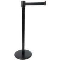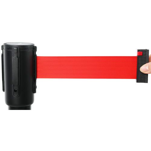 Paal met uittrekbare band en 3 aanhaakpunten. Uittrekbare band met zelfremmend systeem: trekt niet opeens hard in bij het losmaken. Sokkel met rubberen poten voor meer stabiliteit.