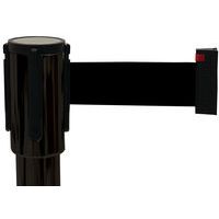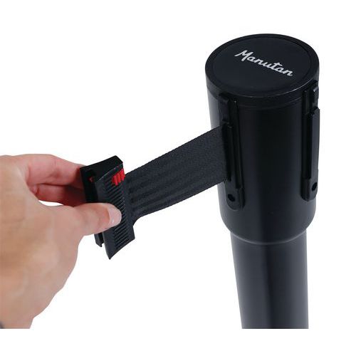 Paal met uittrekbare band en 3 aanhaakpunten. Uittrekbare band met zelfremmend systeem: trekt niet opeens hard in bij het losmaken. Sokkel met rubberen poten voor meer stabiliteit.