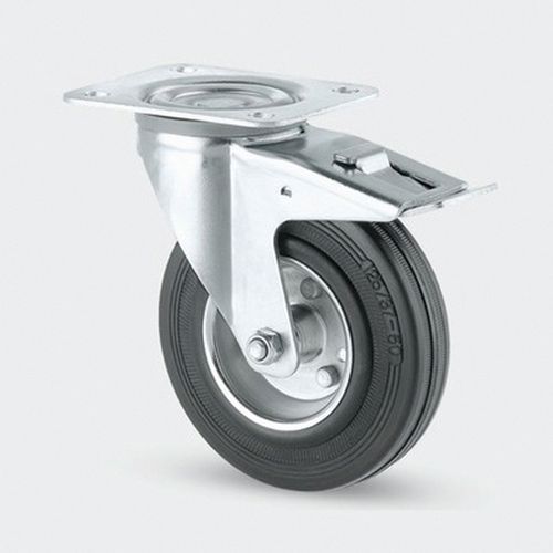 - Zwenkwiel, vork van geperst staal, verzinkt, dubbele kogeldraaikrans in de zwenkkop, wielas geschroefd, plaatbevestiging.