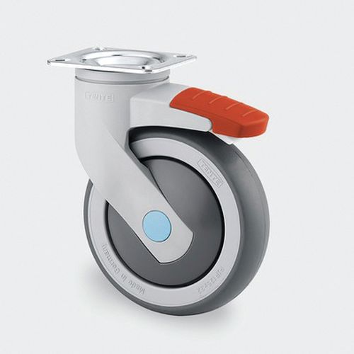- Zwenkwiel, huis van hoge kwaliteit synthetisch materiaal met metalen onderdelen van RVS, met dubbele kogellagers in de zwenkkop., boutgat.