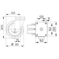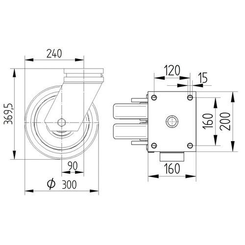 Zwenkwiel, vork en plaat staalgelast, verzinkt chromatiseerd, zwenklager voorzien van axiaal kogellager en kegellager, geschroefd en geborgd, met smeernippel, wielas geschroefd, plaatbevestiging. Wielkern van polyamide, wielnaaf op precisiekogellager, extra zware Heavy Duty uitvoering