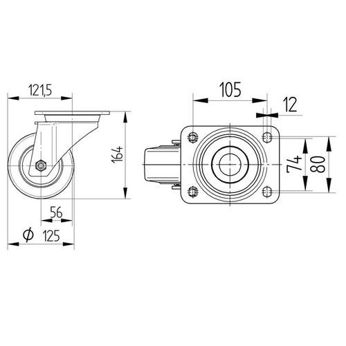 Zwenkwiel, vork van roestvrij staal, met dubbele kogeldraaikrans in de zwenkkop, afgedicht, versterkt dmv geharde lagerschalen, wielas geschroefd, plaatbevestiging. Wielkern van polyamide, wielnaaf op rollager