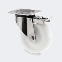 Zwenkwiel, vork van roestvrij staal, met dubbele kogeldraaikrans in de zwenkkop, afgedicht, versterkt dmv geharde lagerschalen, wielas geschroefd, plaatbevestiging. Wielkern van polyamide, wielnaaf op rollager